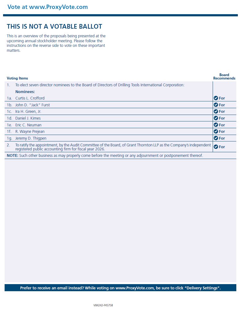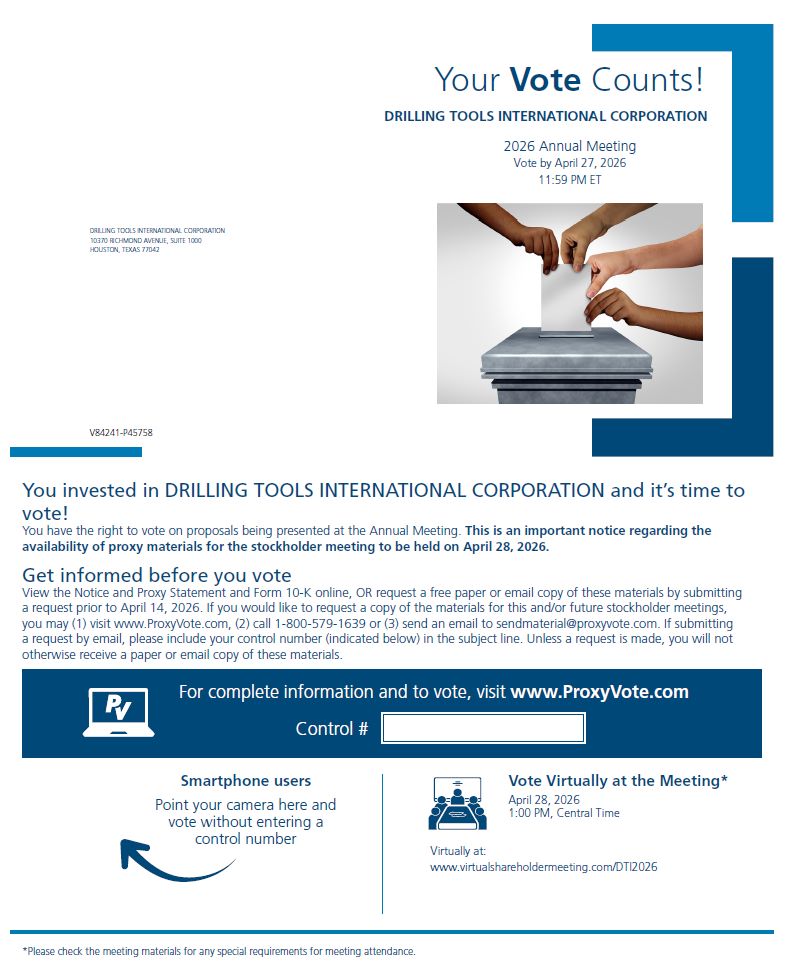 Your Vote Counts! DRILLING TOOLS INTERNATIONAL CORPORATION 2026 Annual Meeting Vote by April 27, 2026 11:59 PM ET DRILLING TOOLS INTERNATIONAL CORPORATION 10370 RICHMOND AVENUE, SUITE 1000 HOUSTON, TEXAS 77042 V84241-P45758 You invested in